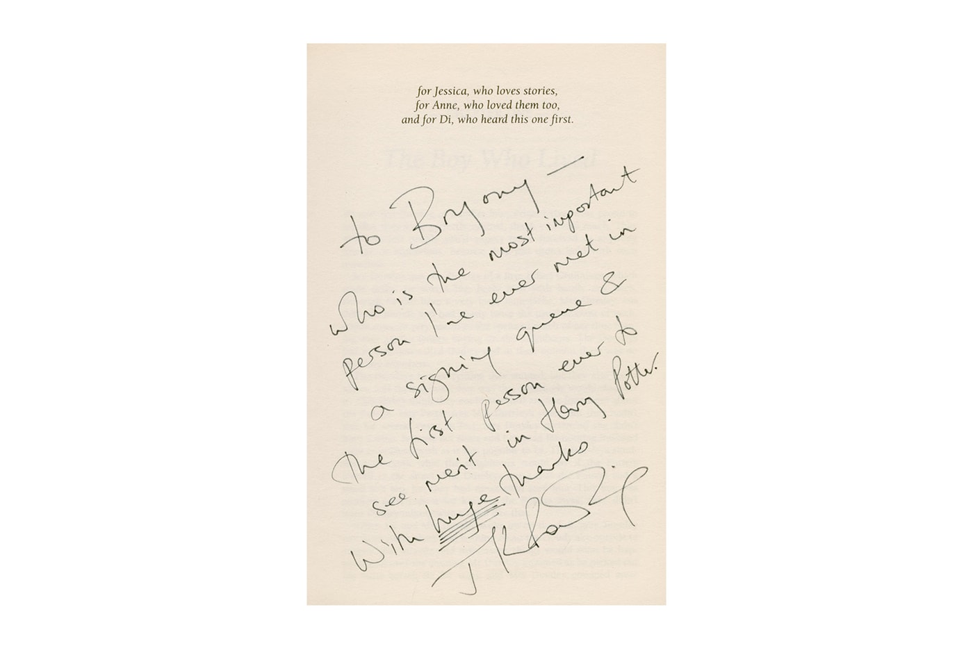 Penulis berusia 54 tahun tersebut pun menuliskan “untuk Bryony – yang merupakan orang terpenting yang pernah aku temui di antrian tanda tangan & orang pertama yang melihat keistimewaan di Harry Potter,” pada buku tersebut.